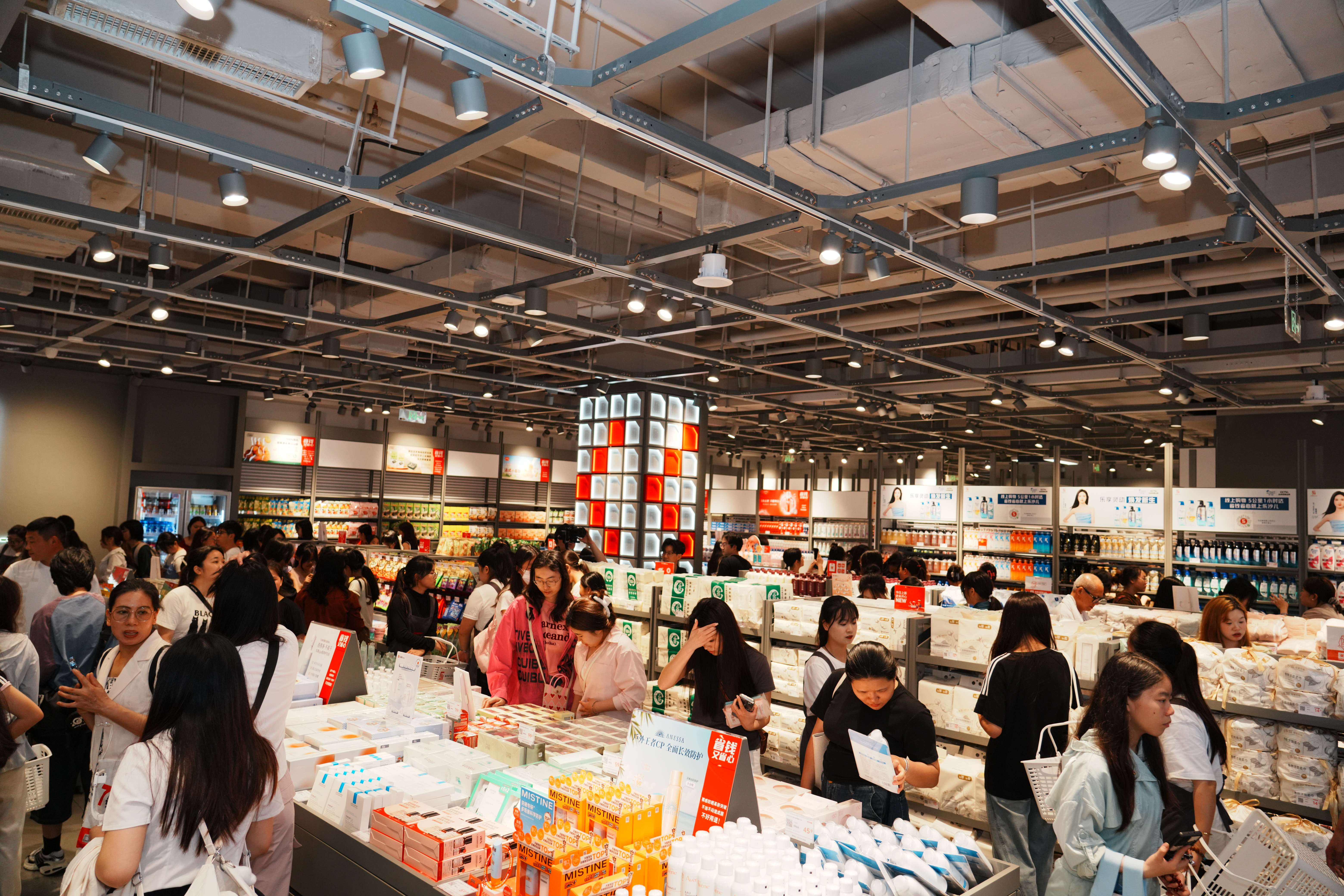 场景打造上,乐沙儿摒弃了传统零售的密集陈列逻辑,转而通过科学的货架摆布减少视觉疲劳——将美妆、零食、宠物用品等分区明确,搭配明亮柔和的灯光与轻松的背景音乐和声光电,让整个空间呈现出“松弛感”。弱化了购物的功利性后,乐沙儿更像一个适合闲逛放空的休闲场所,容纳更多年轻人慢慢挑选。